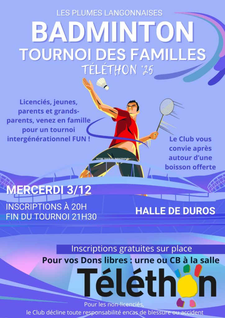 Le tournoi aura lieu à la Halle de Duros le samedi 15 mars de 9h à 13h pour les doubles et de 14h à 18h pour les doubles mixtes. Les inscriptions se font en ligne jusqu’au vendredi 7 mars (pas d’inscription sur place). Chaque joueur fait son inscription et la paye individuellement (pas de recherche de partenaire possible).